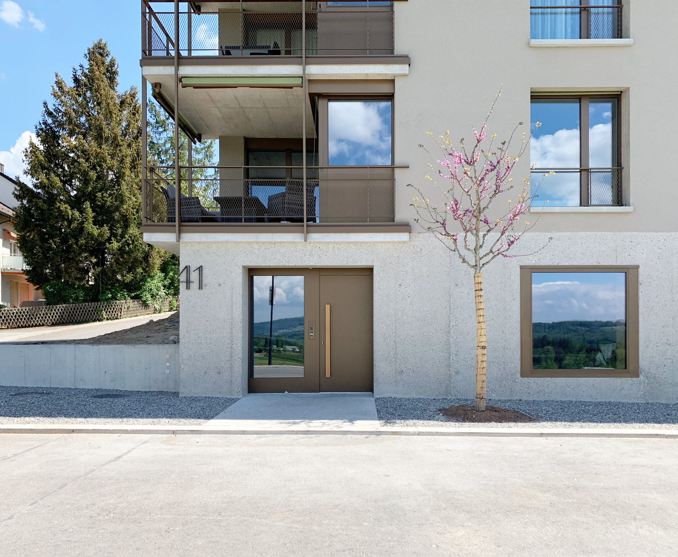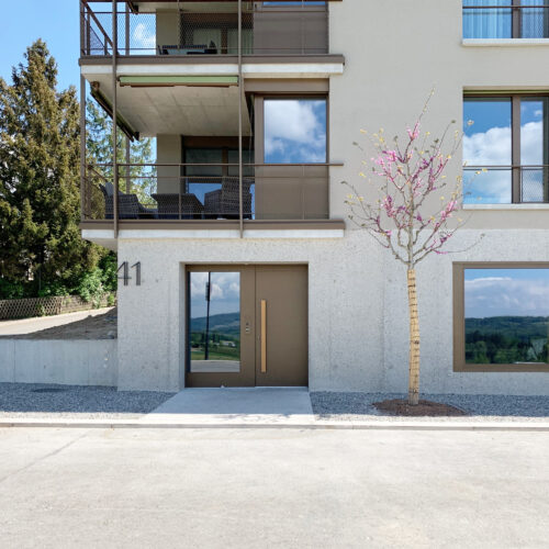 Die bekieste Vorzone des Gebäudes wird mit hochstämmigen Bäumen bepflanzt. Diese fügt sich dadurch in die Strassenraumbepflanzung ein. Die Gebäudezugänge werden in einen geschliffenen Ortbetonbelag ausgeführt.